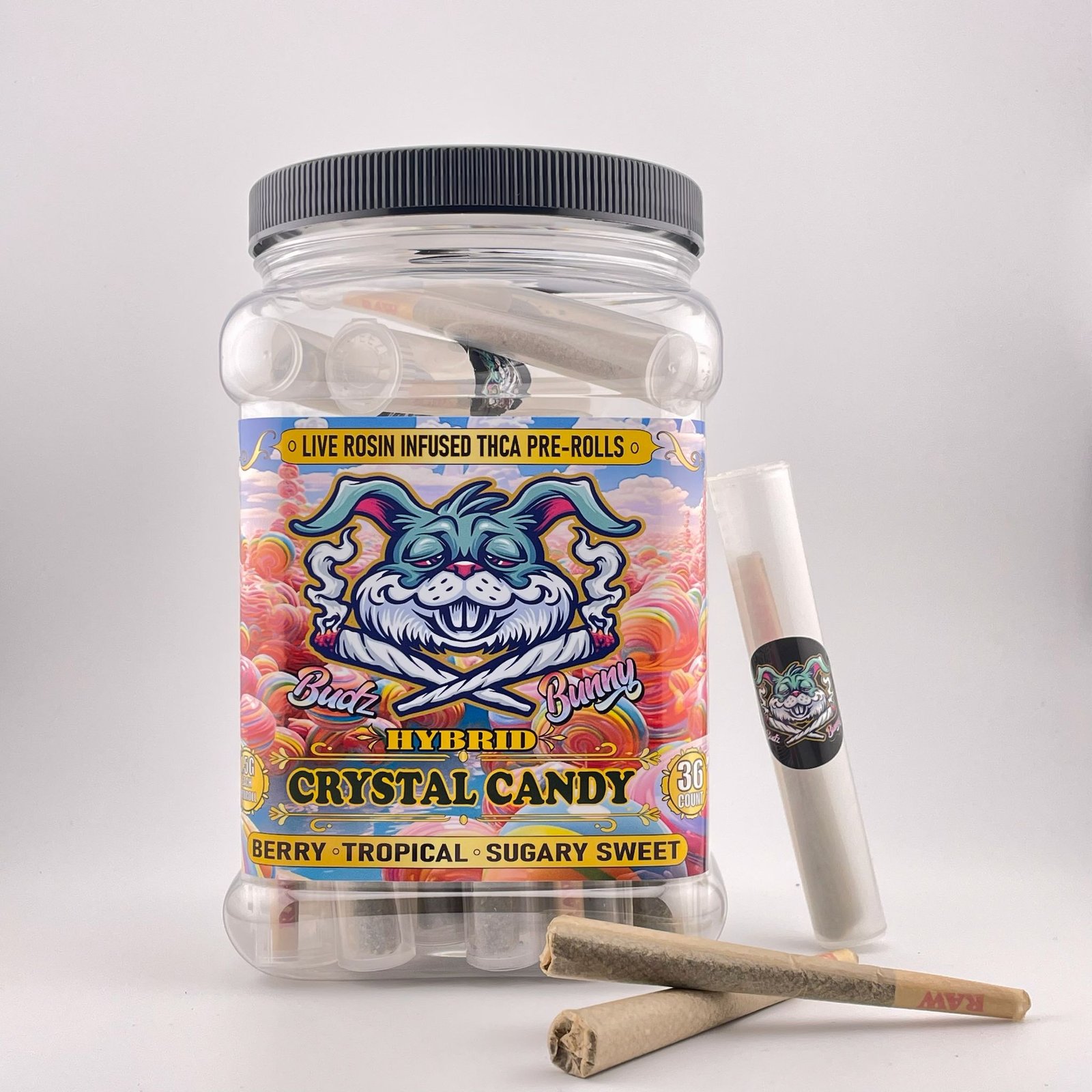 Packaged in a 36-count jar with each roll individually tubed, these pre rolls maintain optimal freshness and structure. Each roll contains 1.5 grams of premium flower, ensuring consistent quality and an enjoyable experience from start to finish. Crystal Candy Pre Rolls are crafted for those who seek a flavorful, convenient, and balanced Hybrid experience.