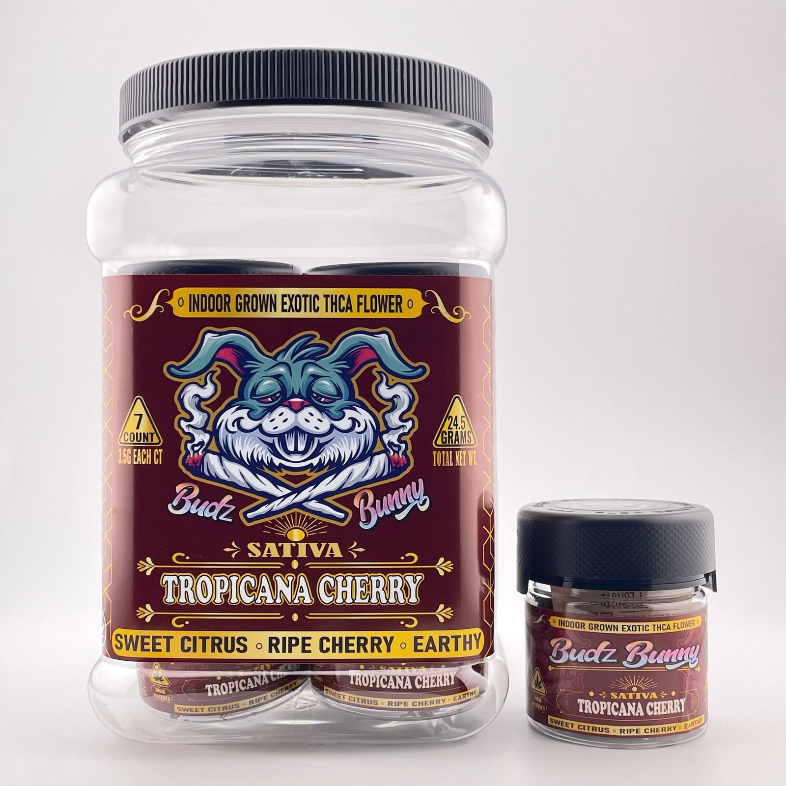 The Tropicana Cherry is an Exotic Sativa THCA Flower presented in a 3.5g (7ct) format, offering a vibrant and flavorful smoking experience. Its buds are visually striking with bright green tones, deep purple streaks, and a frosty trichome coat that reflects its exotic-grade quality. The aroma bursts with sweet-tart cherry notes blended with tropical citrus, creating a refreshing and fruity bouquet that energizes the senses before the first inhale.